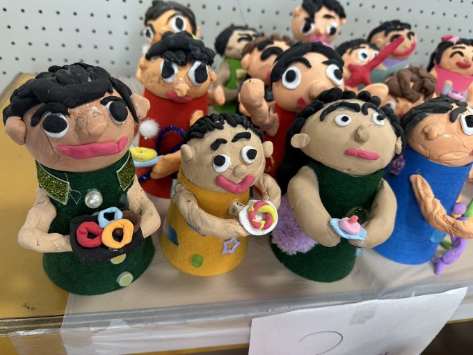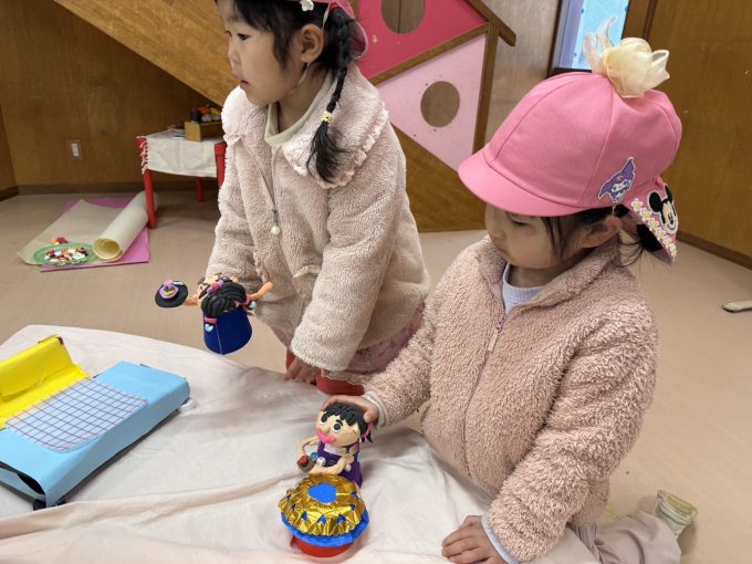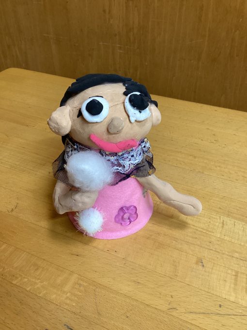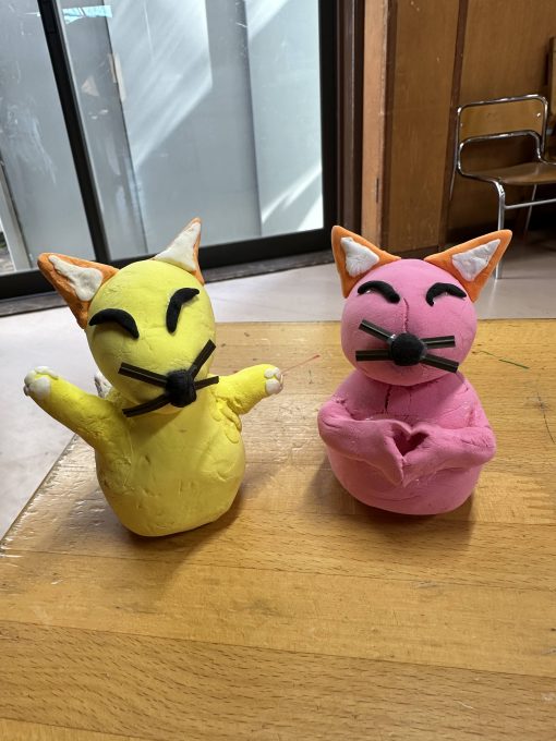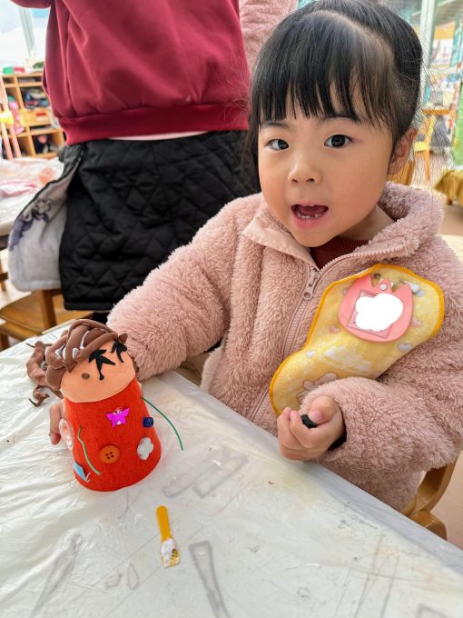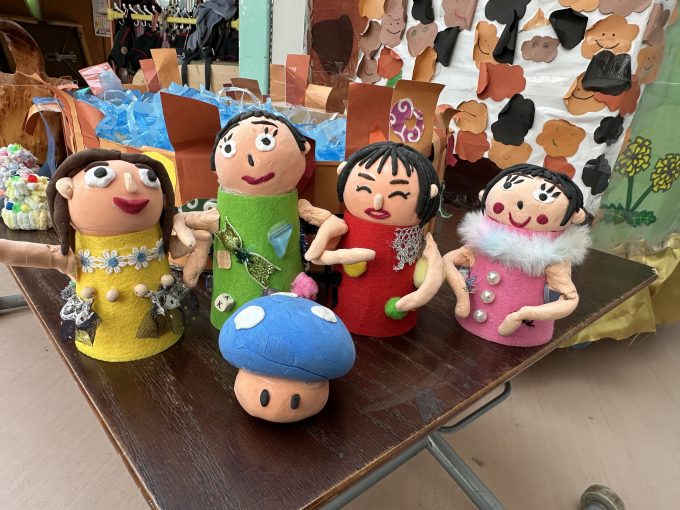 それぞれのクラスで計画中のお店屋さんになりきって、服のデザインと顔の表情、腕の動きを作りました。