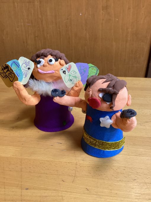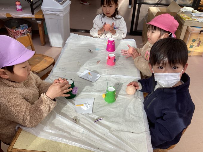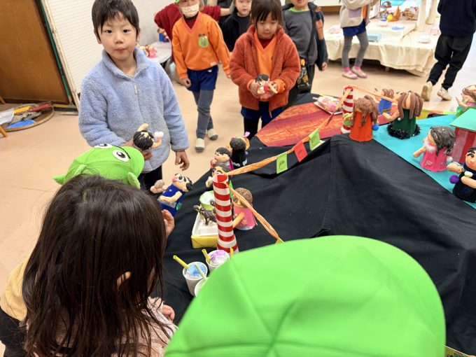 それぞれのクラスで計画中のお店屋さんになりきって、服のデザインと顔の表情、腕の動きを作りました。