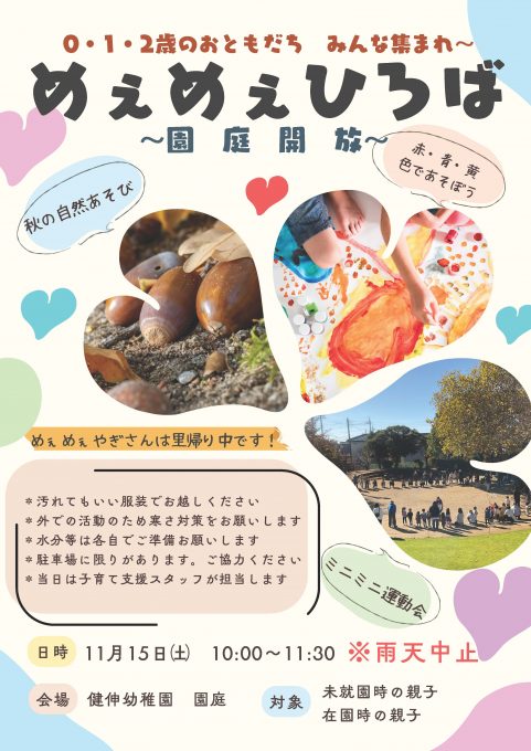 【園庭開放】めぇめぇひろば ~ミニミニ運動会🏃~ 2025年11月07日 トピックス 毎回たくさんのおともだちが遊びに来てくれる『めぇめぇひろば』 秋の澄んだ空気の中 みんな元気に走っちゃおう😊! 11月は【ミニミニ運動会】を開催します🏃🏃🏃 秋の自然を使ったあそびや、人気の色あそびも企画しています🍂🍂 ぜひみなさん遊びに来てくださいね。 ※外企画のため雨天中止です 戻る
