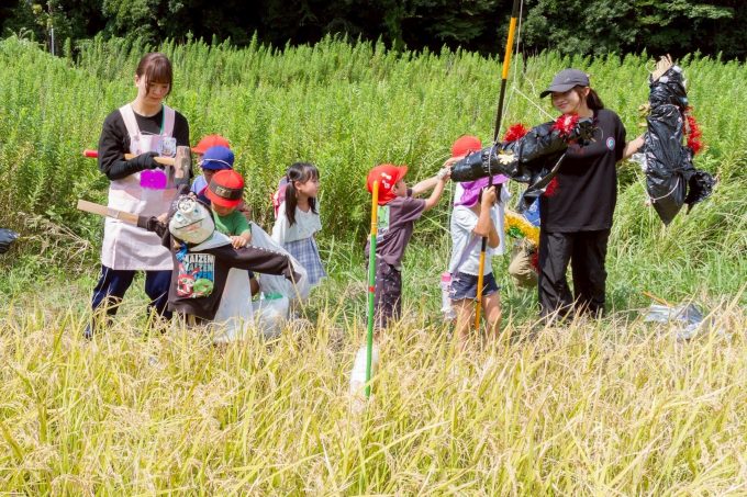「かかしをつくったら?」「すずめは、おおきいとりがきらいみたい!からすをつくってたんぼにたてるのは?」