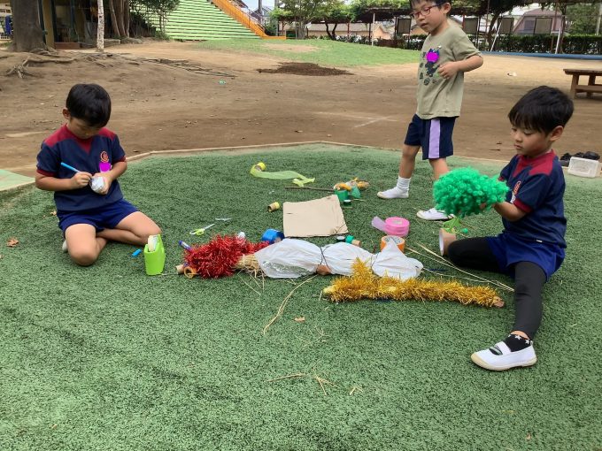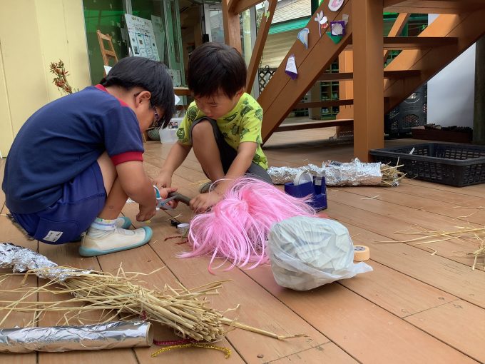 デッサンを元に、昨年の松組が殘してくれたわらやアルミホイルなどを使ってかかしをたくさん作っていきました!