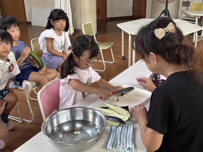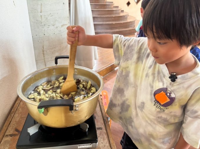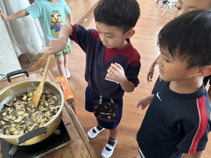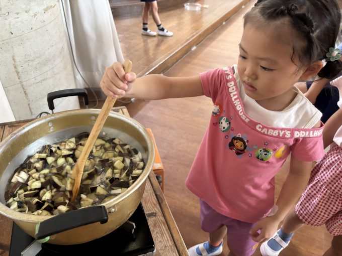 みんなで切ったナスは、しっかりアク抜きをして「ナスカレー🍛」に!