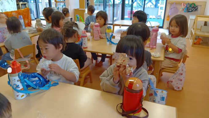 おなかがすいたらみんなでおにぎりをパクっ!!みんなで食べるとおいしいね🎵
