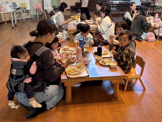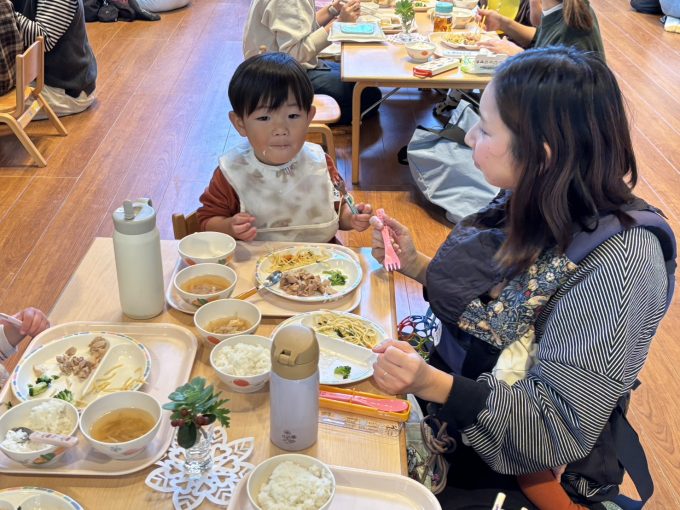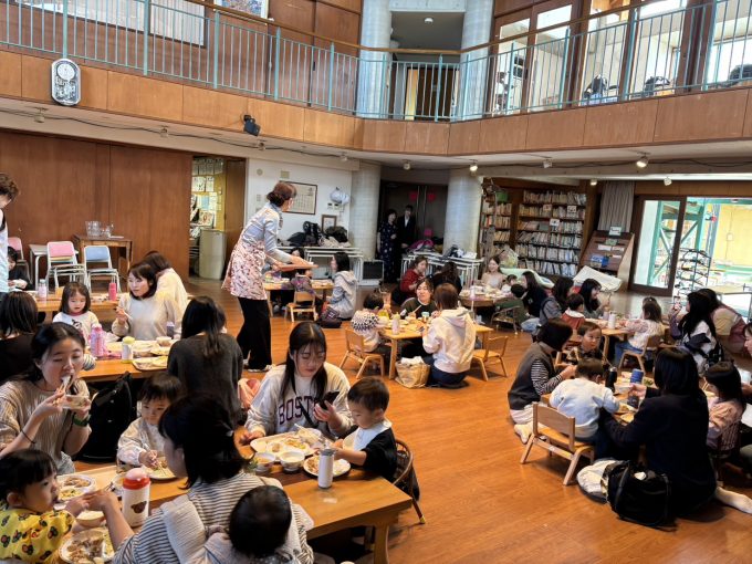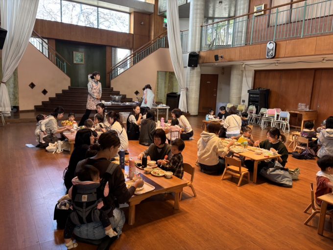とってもいいお天気の中、田中栄養士さんのお話&ランチ会が幼稚園のホールで開催されました。