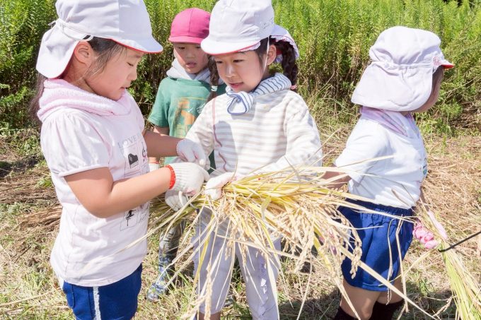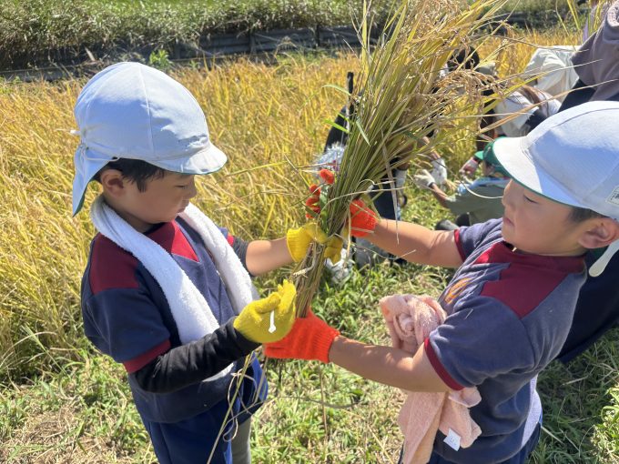 本物の鎌に『ちょっとこわーい!』『ザクザクするのが気持ちいい!』とドキドキワクワクしながら稲刈りをしました。