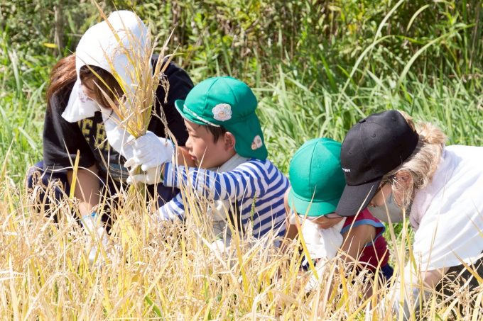 自分たちが植えた稲を前に『やったー!お米がたくさんついてる!』と喜ぶ子どもたち