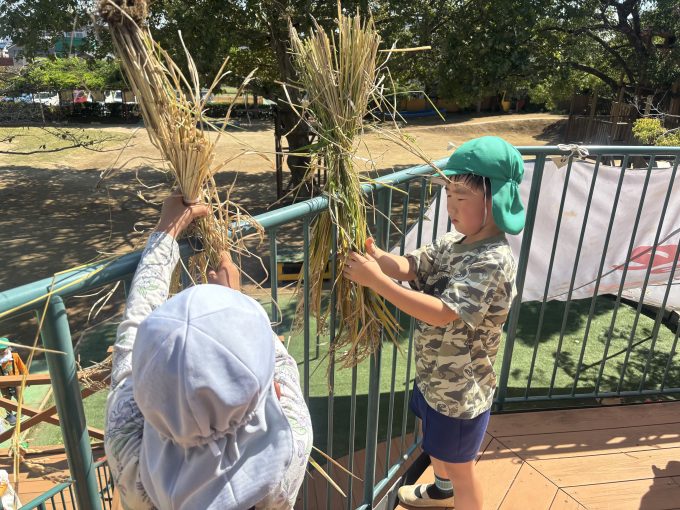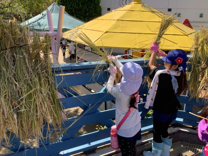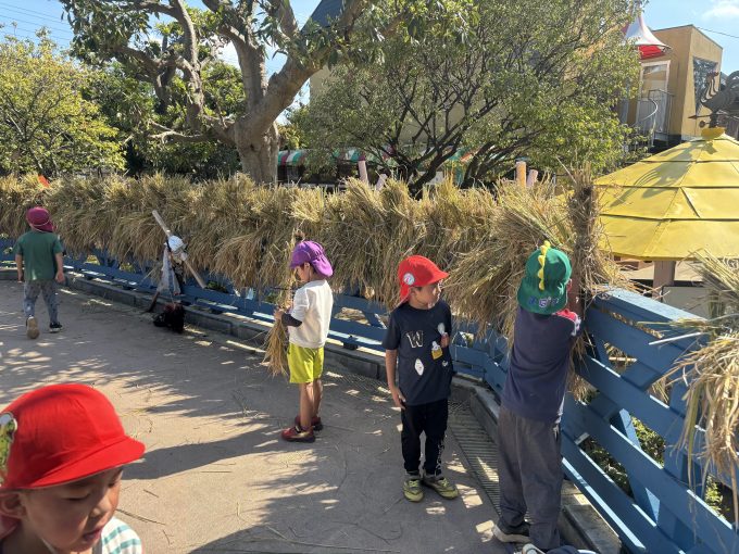 幼稚園に帰ったら、プールサイドと緑の棟の2階に稲を干しました。