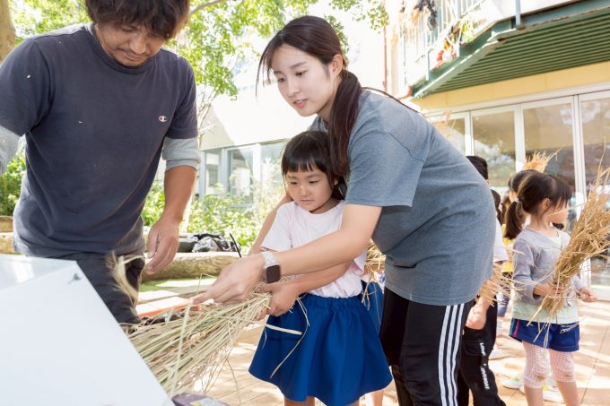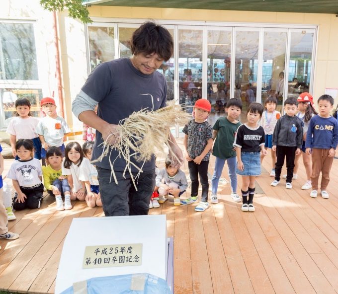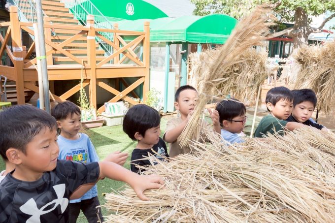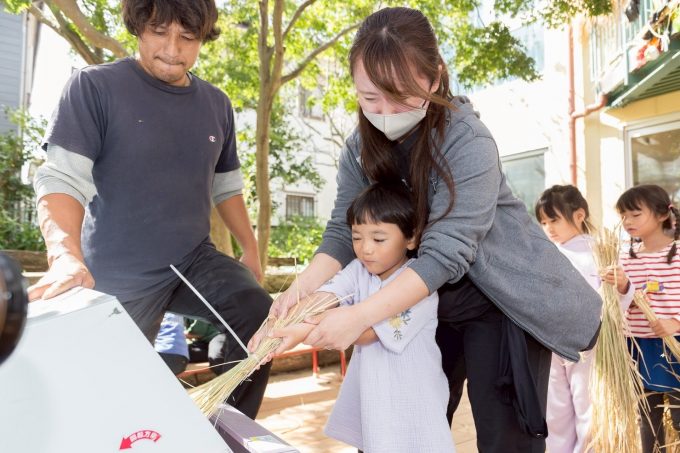 卒園記念品としていただいた足踏み脱穀機『とれる~の』くんの出番です。