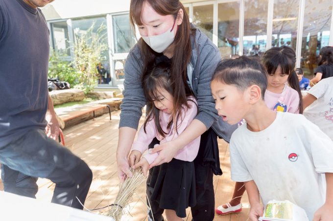 リズムよく足を動かすと、中のローラーがすごい音をたててグルグルと回ります。その音やあっという間にバラバラになったお米を見た子どもたちは『すご~い!』『お米がもうついてないよ!』驚いた様子でした。