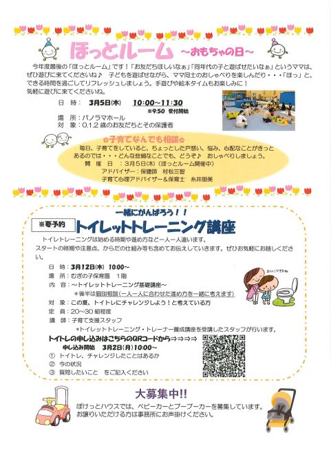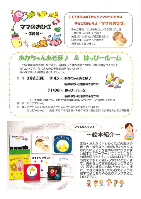 3月は、『あかちゃんあそぼ』・『はっぴールーム』・『ほっとルーム』があります😊