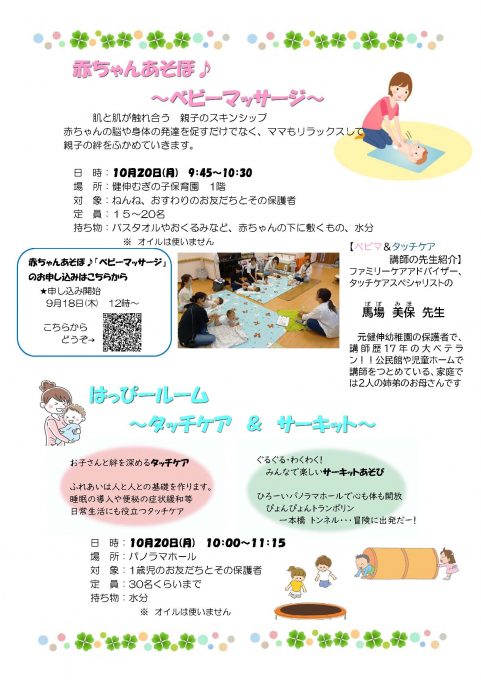 10月20日(月)には、ねんね、おすわりのお友だち対象の『あかちゃんあそぼ♪ ベビーマッサージ』、