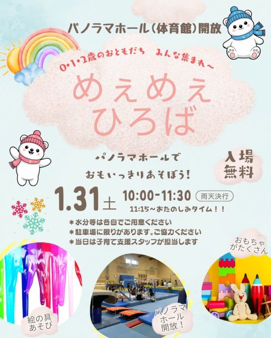 🌈1/31は【パノラマホール開放】めぇめぇひろば🐐 2026年01月06日 ママのおひざ あけましておめでとうございます🎍 本年も《ママのおひざ》では楽しい企画を用意してお待ちしています😊 どうぞよろしくお願いします。 今回の『めぇめぇひろば』は、みんな大好きパノラマホールで遊ぼう!!です。 11:15~はお楽しみタイムが始まるよ🥰みんなお部屋に集まれ~🎵 みなさんのお越しをお待ちしています。 戻る
