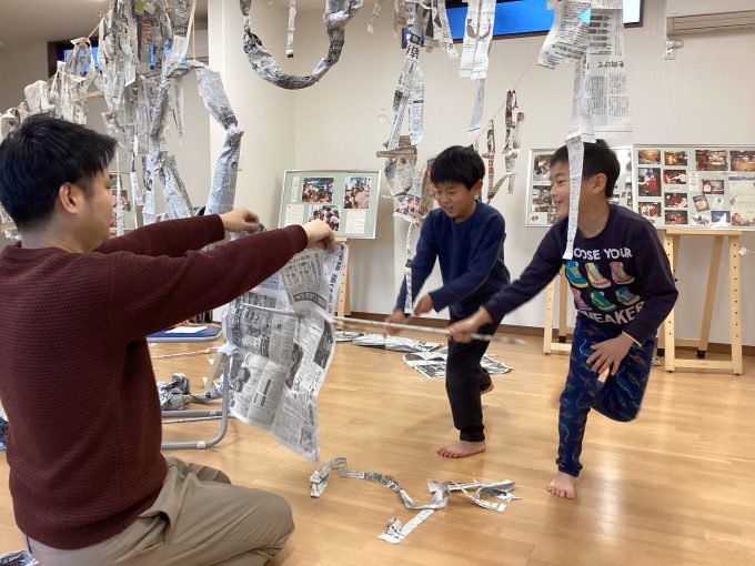 新聞紙あそびに親しむ機会の減ってきた子どもたち。