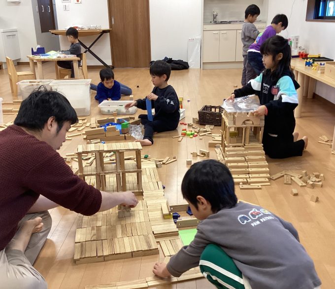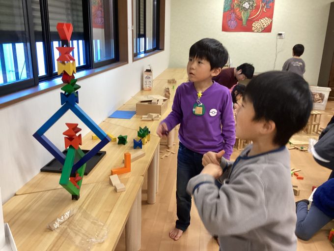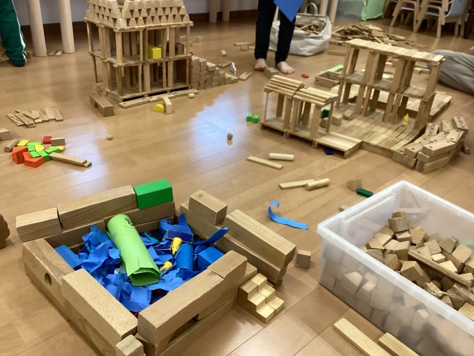 幼稚園中の積み木を集めて、参加したお友だちとみんなで楽しみました。