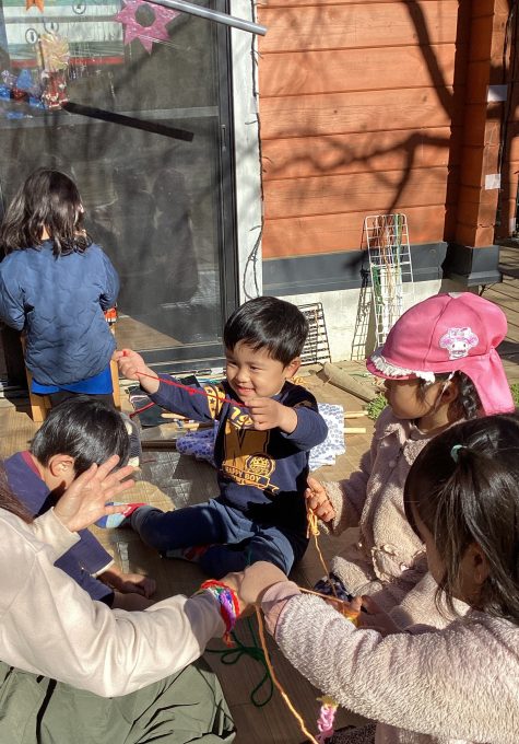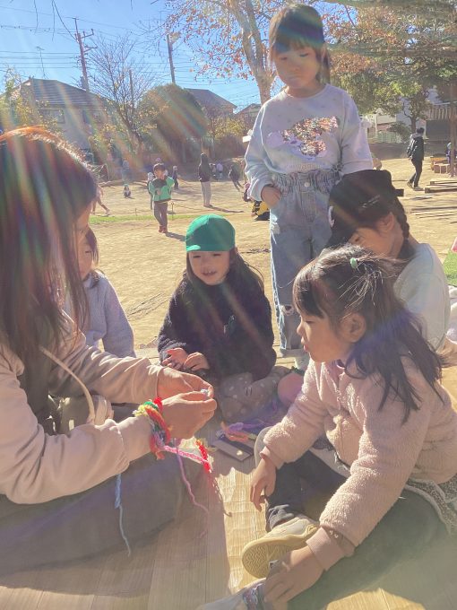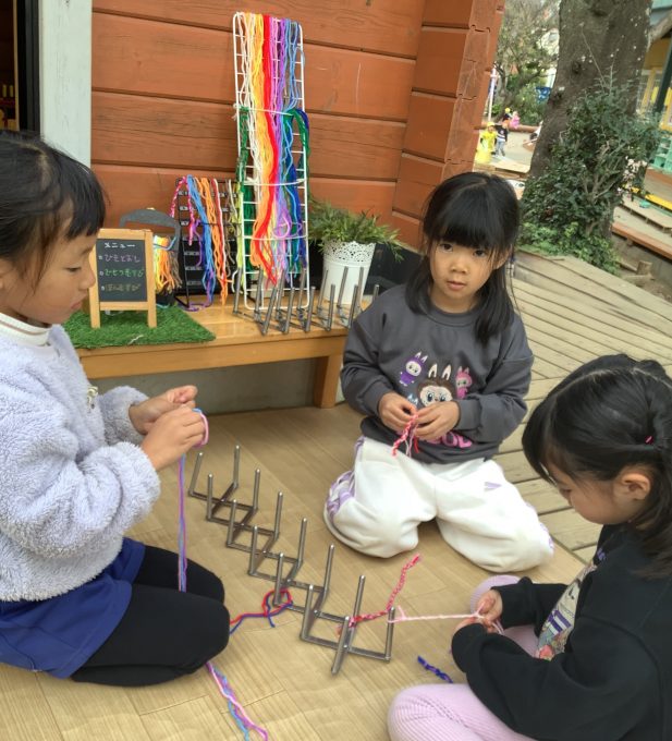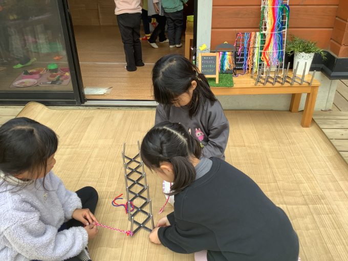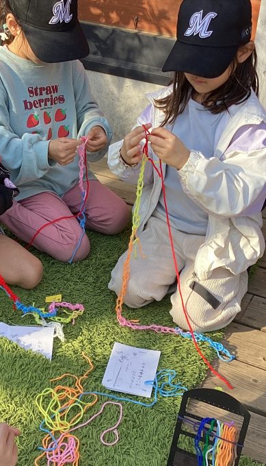 様々な技法を楽しんできた子どもたちから、新たな発想で楽しい紐遊びが生まれてきています。